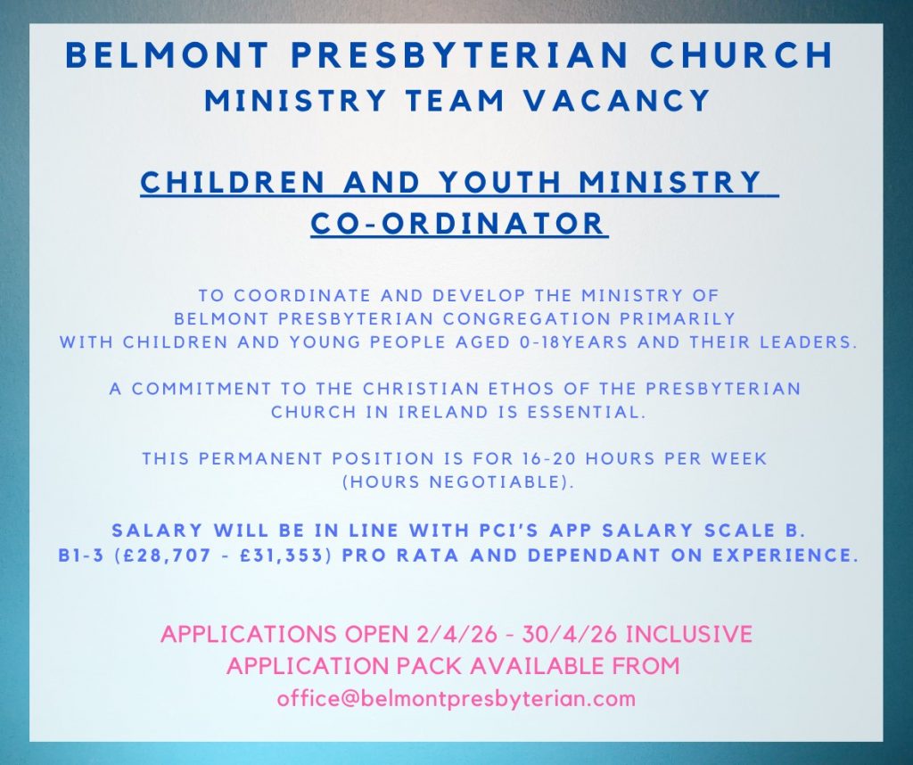 Welcome! We would be delighted if you would like to join us for worship on Sunday either in person, via our livestream on our Youtube channel (Belmont Presbyterian Church, Belfast) or via our telephone service ‘Speak O Lord’ on 028 96928944